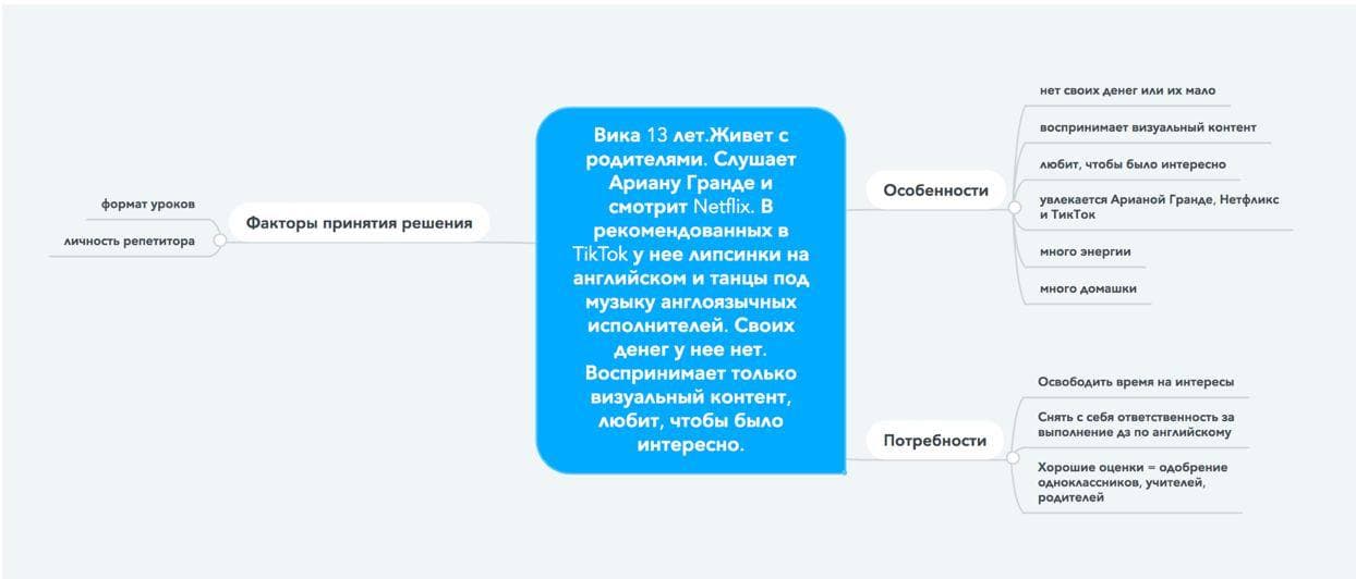 Например, для Даши второстепенными критериями являются квалификация и опыт репетитора. Даше не надо сдавать экзамен, ей не нужен четкий, структурный подход, который репетиторы вырабатывают с опытом на протяжении нескольких лет практики. Такой формат будет давить на нее. Даша приходит на урок развлечься и отдохнуть, пообщаться, поделиться новостями с любимым репетитором. Обсудить на английском актуальные для нее темы на примерах видео из ТикТок ( Очевидно, уже не из ТикТок, а какого-нибудь ВК) постов в соц.сетях Арианы Гранде и ее песен. Поэтому для Даши важными критериями будут личность репетитора и формат уроков.