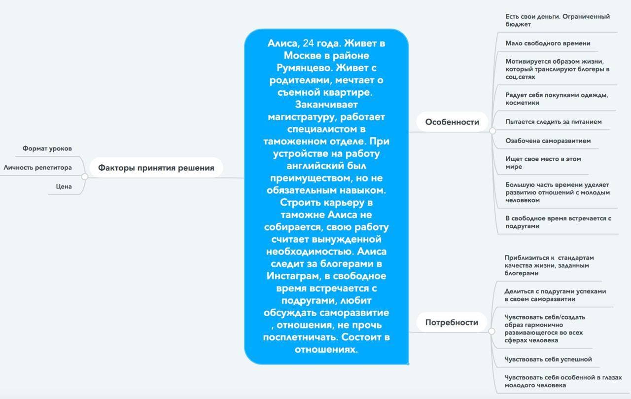Изучите описание, особенности, потребности и факторы принятия решений персонажа на схеме.